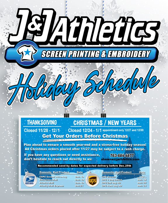Whether your team is making a playoff run, heading to state, preparing for spring, or launching the new season, J&J Athletics is ready to help! Contact us today to start your order or to help bring your ideas to life.